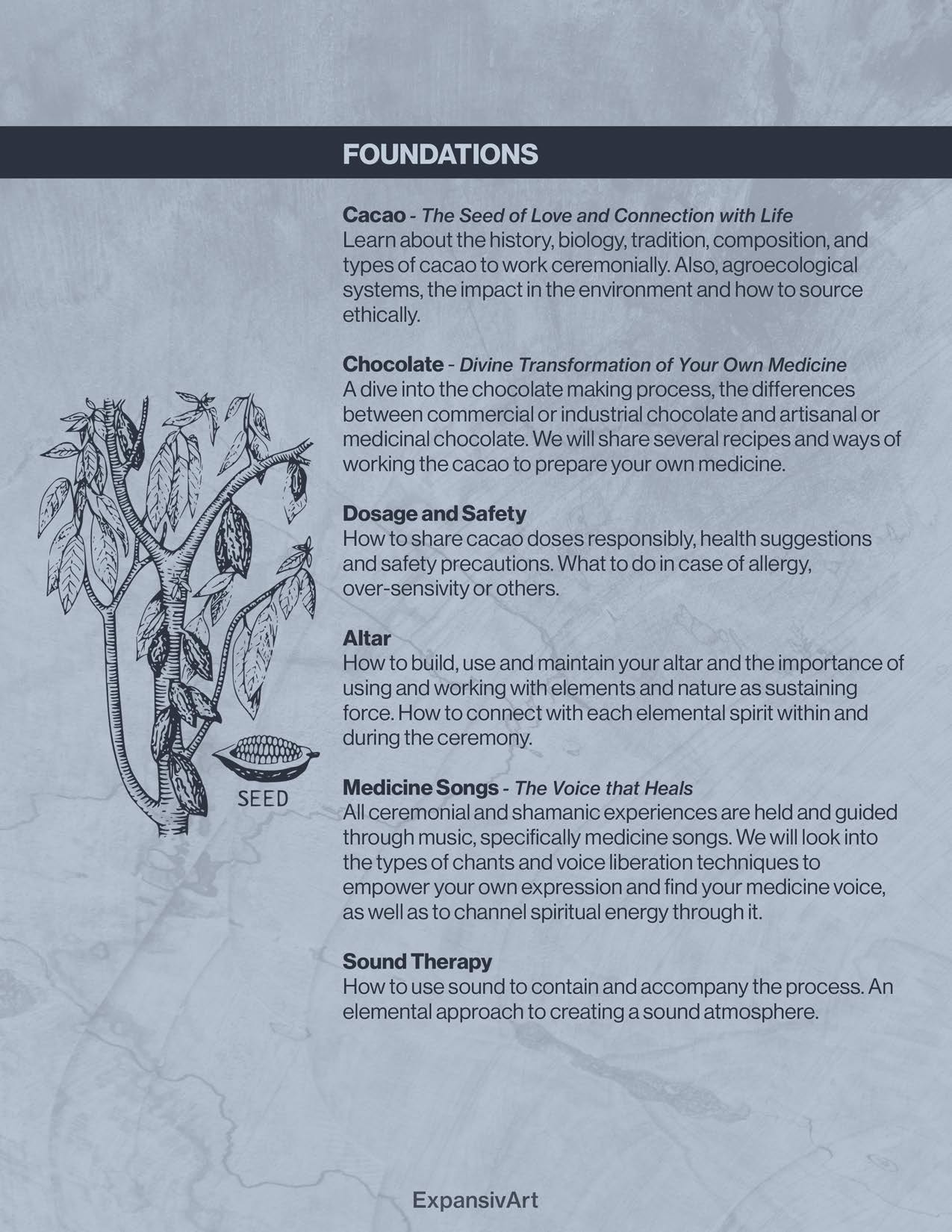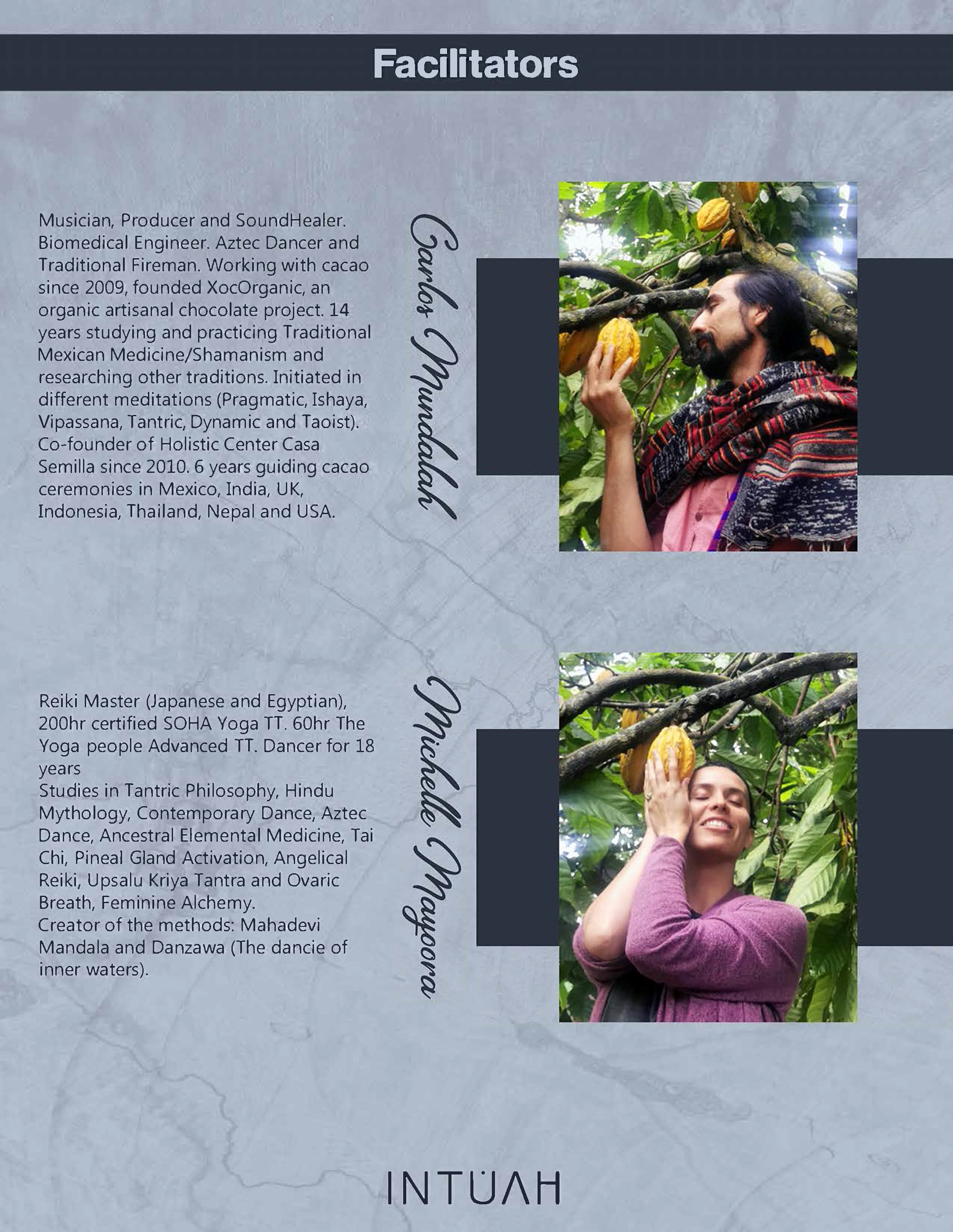 We suggest you having a reliable source of cacao, preferably from agroforestry / respectful source. It may be whole beans, nibs, paste, or non-alkalized pure powder. If you cannot get some, we can help you in that process. Other basic and relatively easy ceremonial and cooking needs will be handed to you after registration (candles, incense, pot, mixer, chilli, herbs, altar cloth, cotton belt, etc)